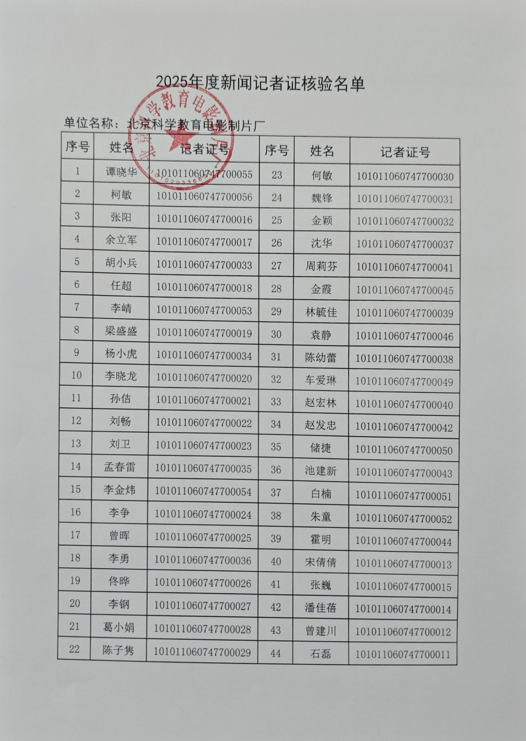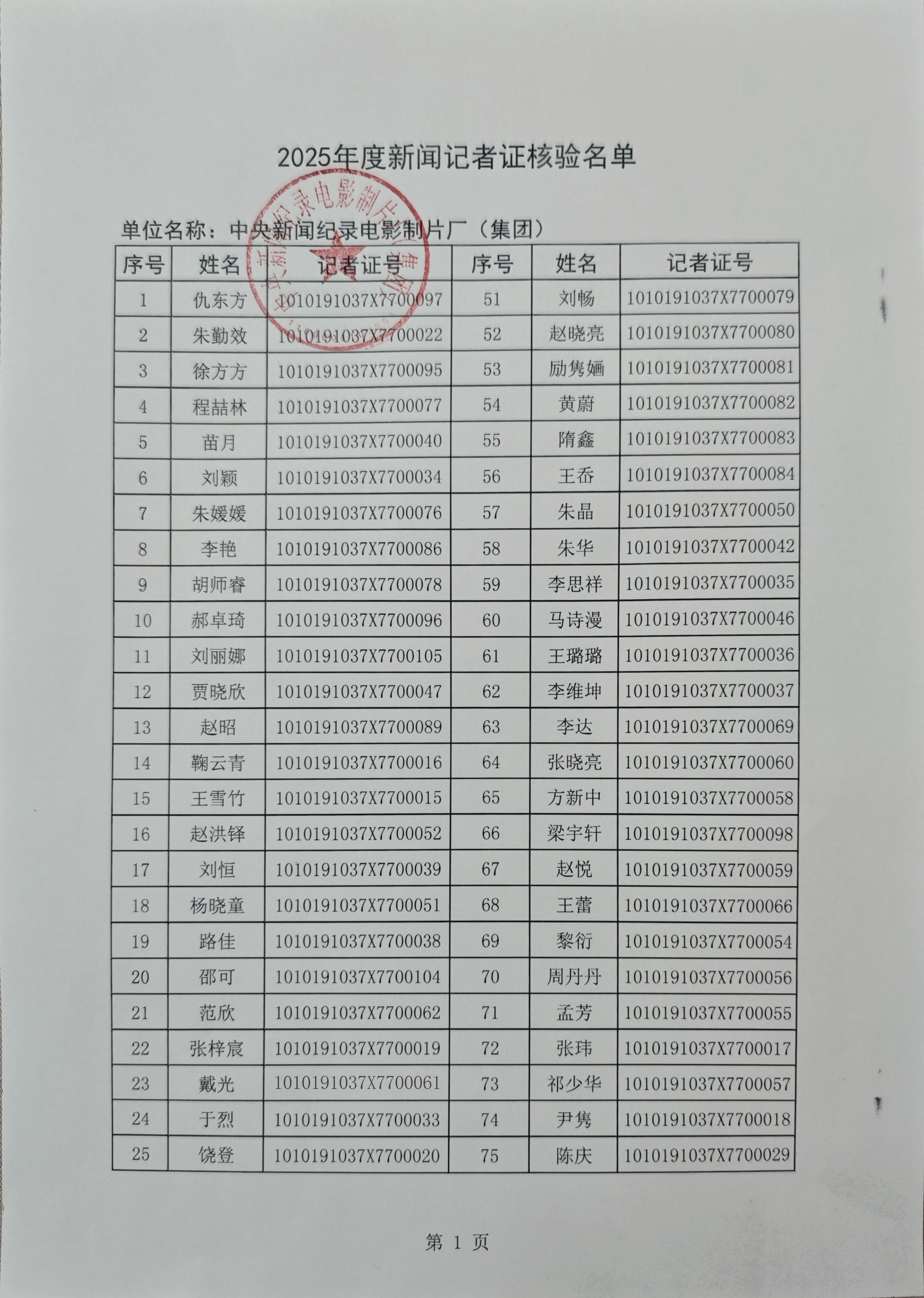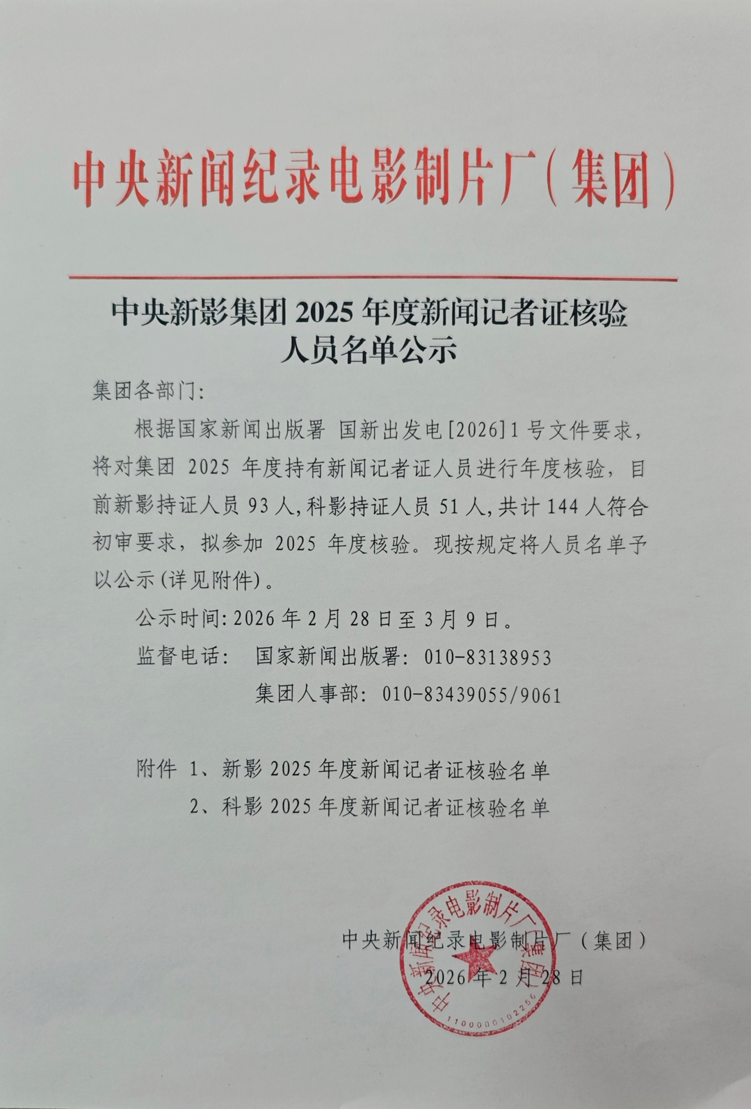 中央新影集團2025年度新聞記者證核驗人員名單公示